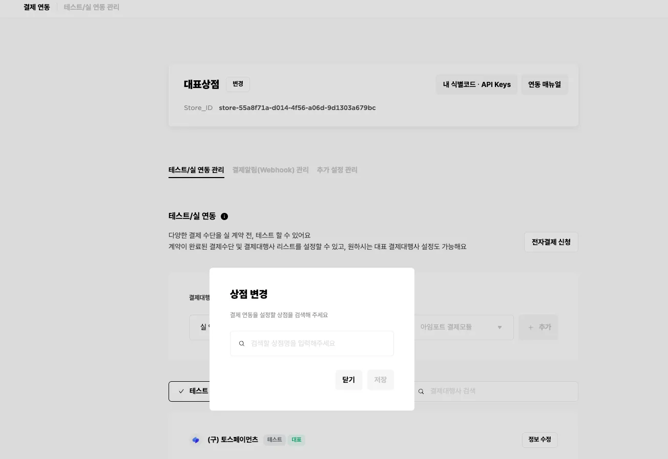 - 결제 연동 기능만 사용이 가능하며, 상점 계정 관리는 조회만 가능합니다.