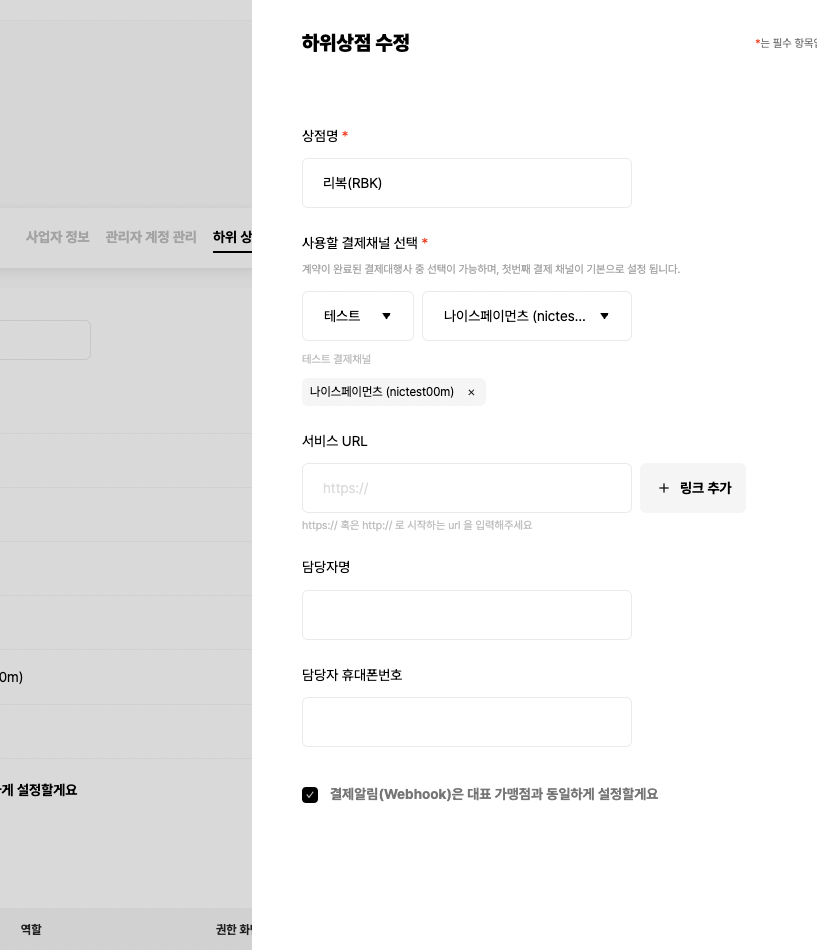 - 상점/계정 관리에서 하위상점 관리 > 별도로 웹훅을 설정할 하위상점 선택