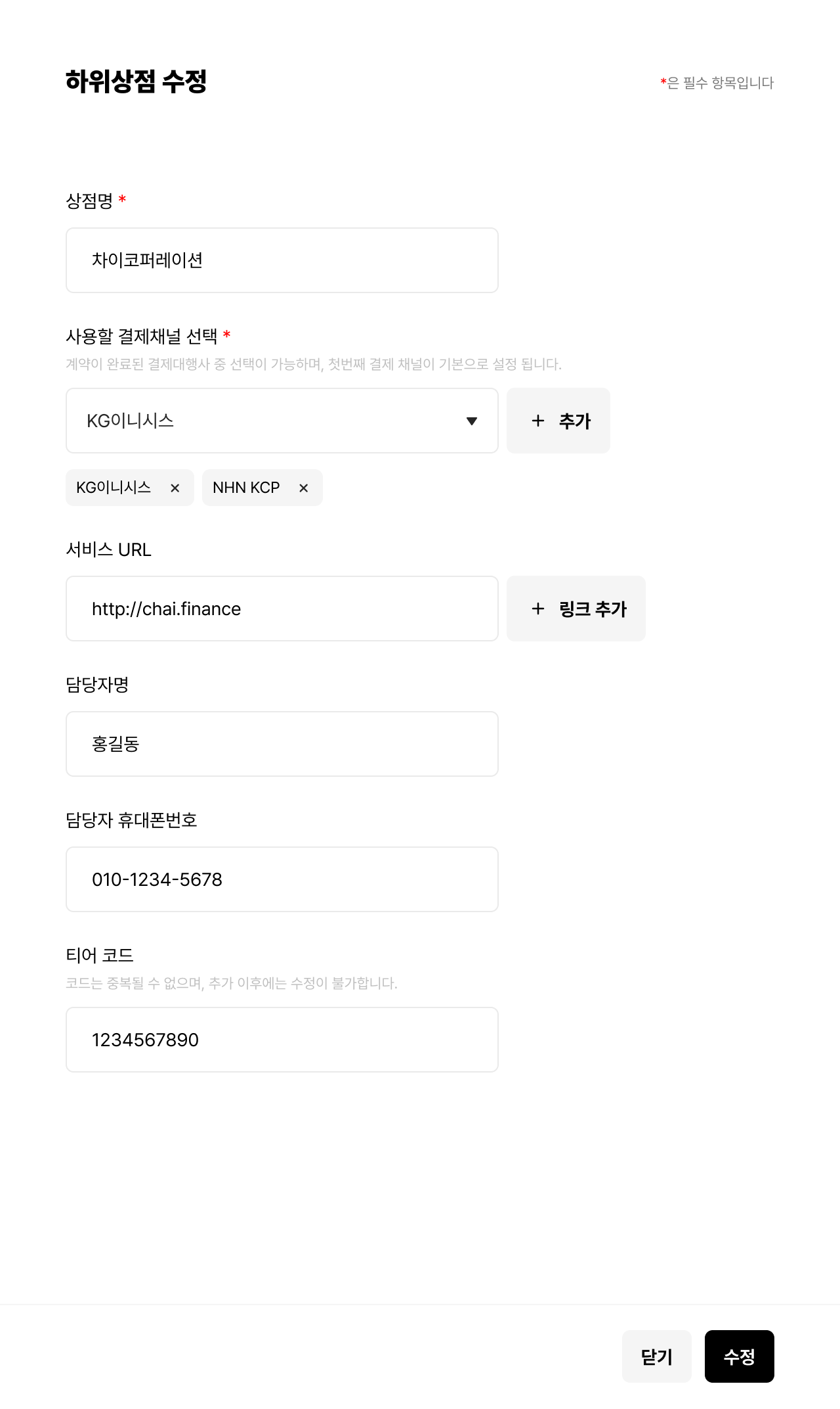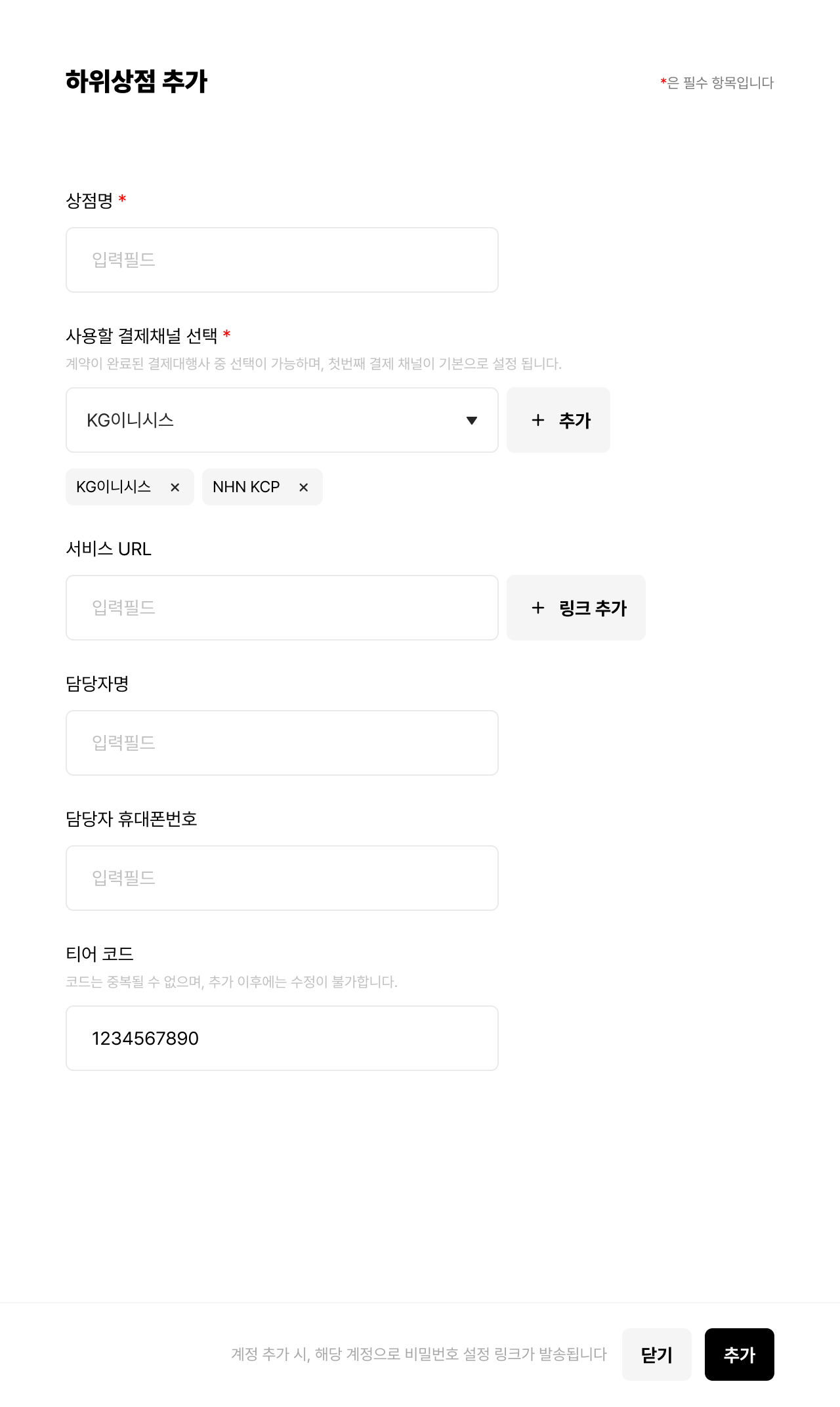- 상점 명 입력, 사용할 결제채널 선택, 서비스 url 입력, 담당자 정보 입력, 티어코드 입력 후 하위상점을 추가하실 수 있습니다