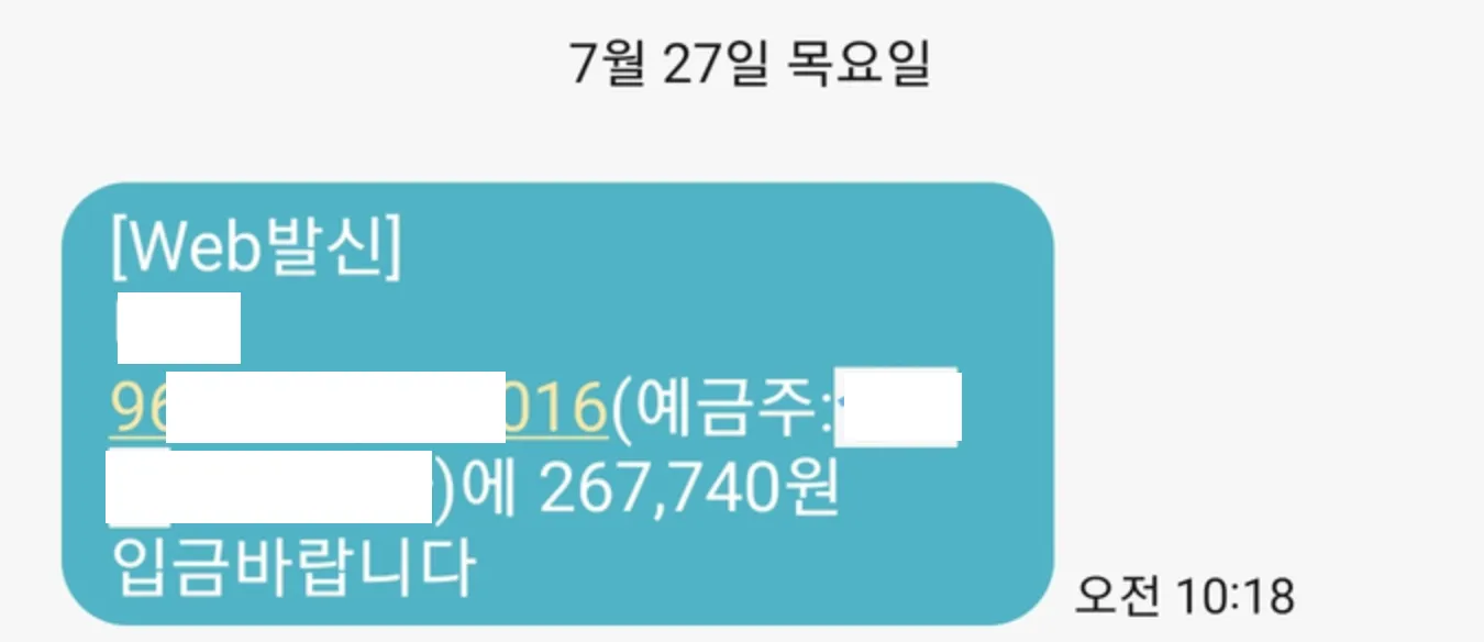 고정식 가상계좌 발급이 정상적으로 이루어지면 아래와 같이 고객휴대폰 번호로 SMS가 발송되며 고객은 해당 정보를 보고 입금을 할수 있습니다.(비용: 무료)